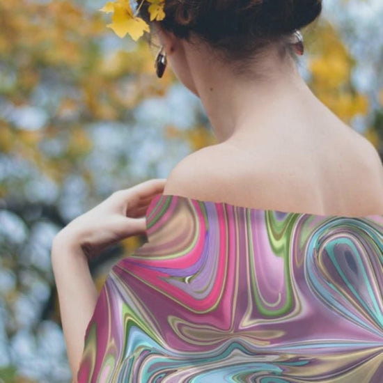 Go back in time with this fun, digitally created fluid and psychedelic design. A combination of almost every color you can think of is in this piece. Easily use this scarf to accessorize anything you already own. Use for the office or out on the town. Wear as a shawl with a solid-colored dress for a pop of color. This scarf is sure to be a favorite one with its versatility.