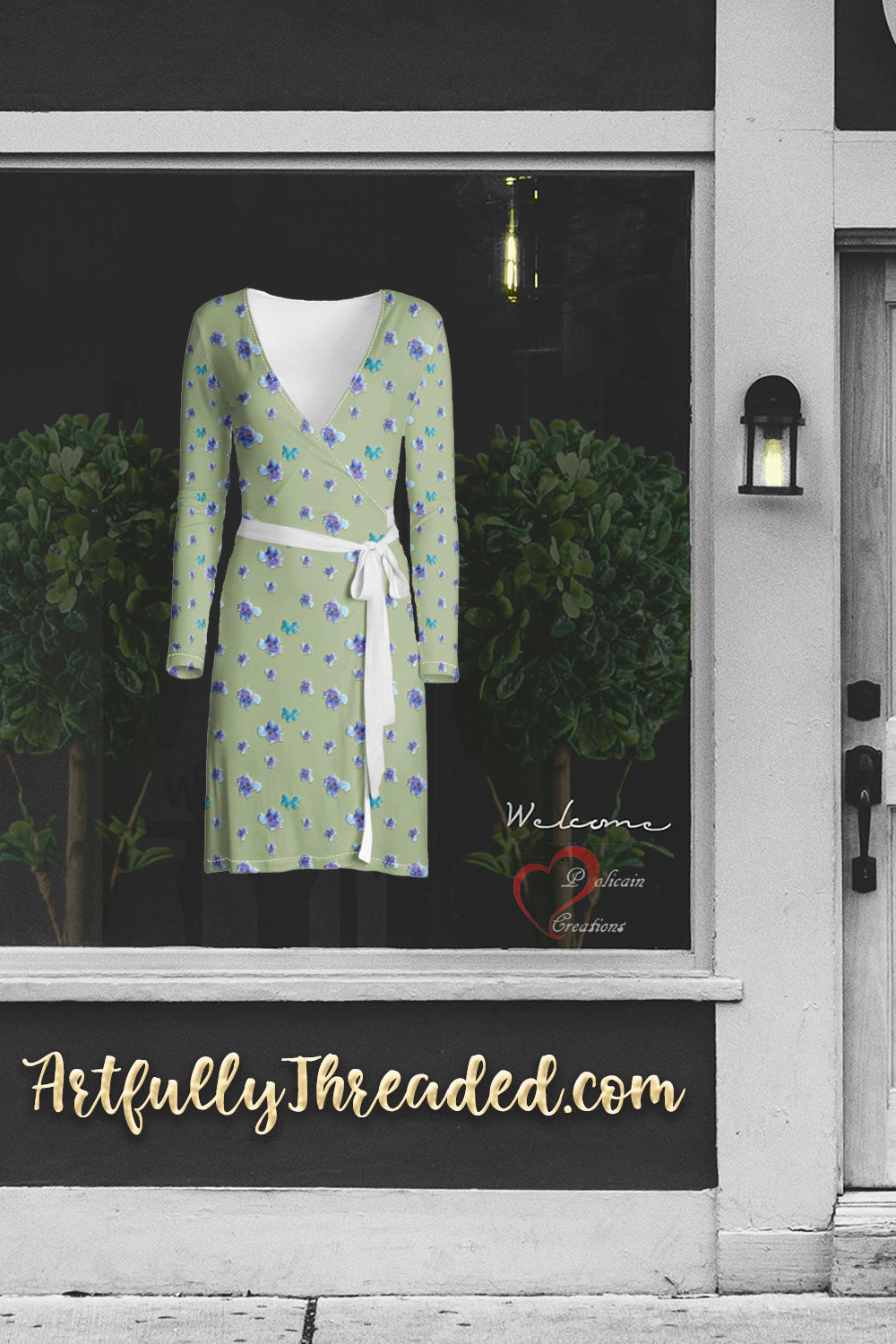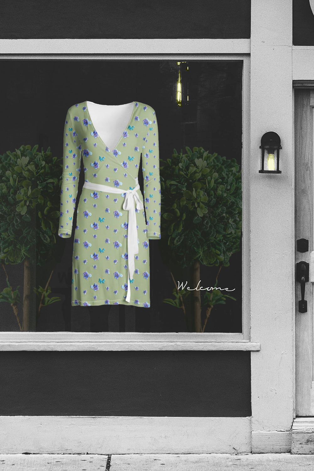 Simple purple and blue flowers float against a soft green background in this understated but beautiful pattern. Choose from jersey or Solange silky jersey material. Long sleeve with V-neck and above-the-knee length with a slim fit with belt tie.