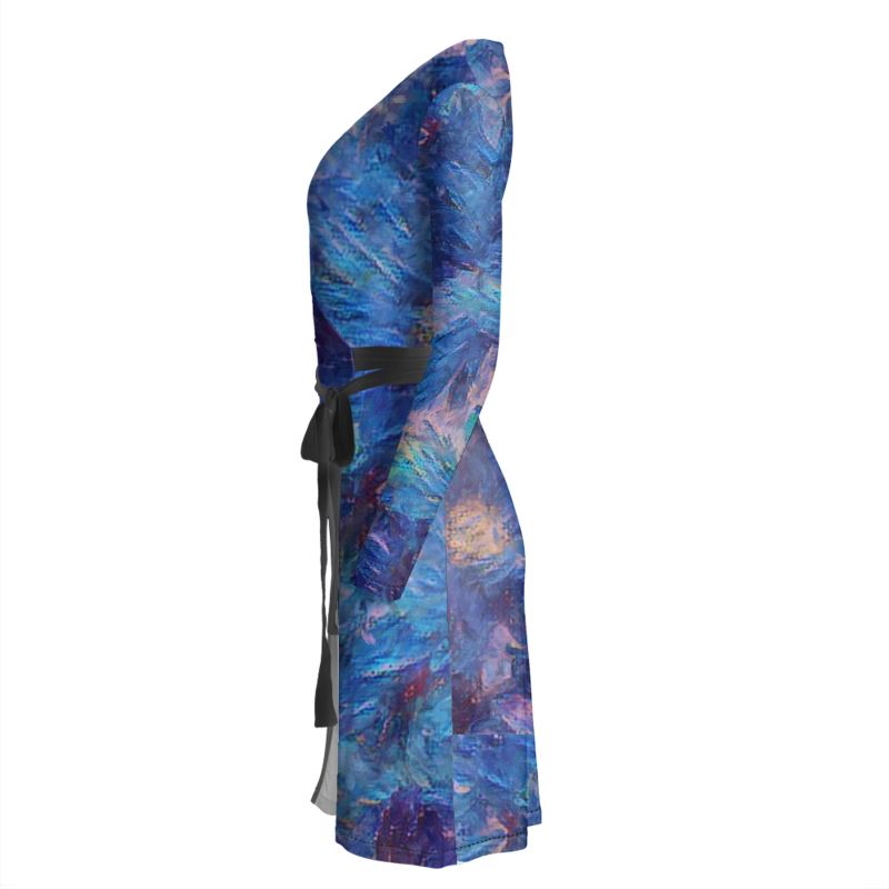 This wrap dress is designed with elegance and finesse in mind, showcasing a Van Gogh inspired floral print in stunning blues, pinks and a hint of yellow. The lightweight fabric and mid-length style make it the perfect choice for any special occasion. Enjoy the figure flattering fit and timeless look for years to come.