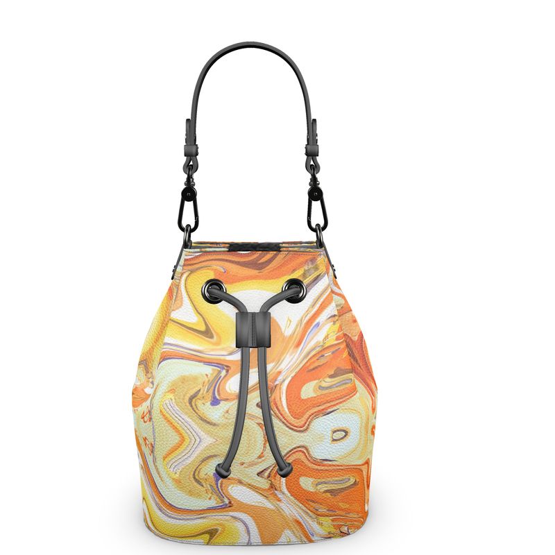 Brighten up any day with the yellow and orange abstract art of the Coffee and Caramel design on this bucket bag.  Made with genuine Nappa leather, this bucket bag has a drawstring pull closure, luxurious faux suede lining and measures 10" x 9.1" x 4.3".  Bag is handcrafted to order.
