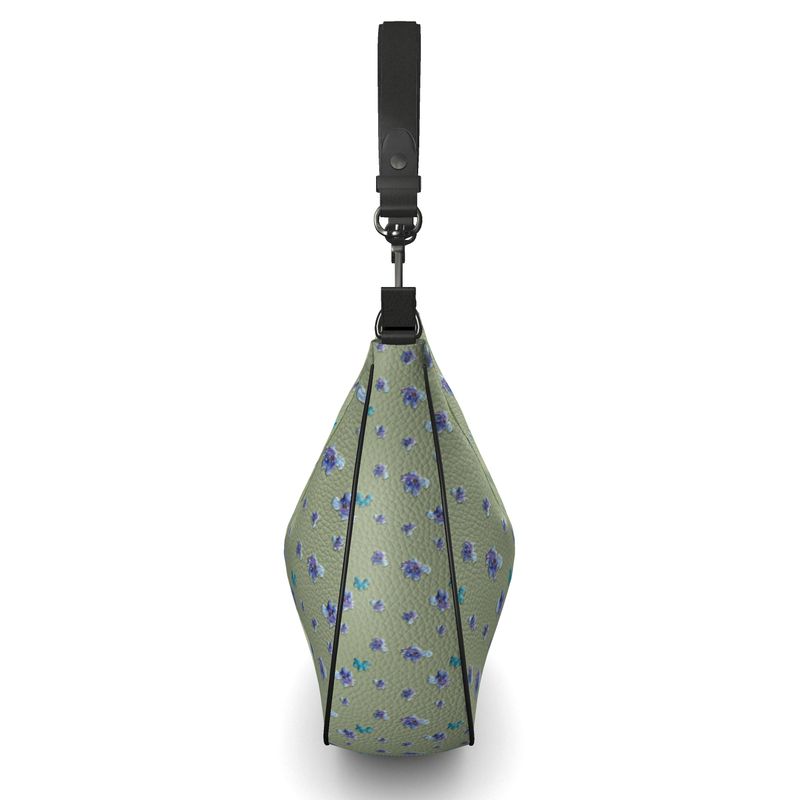 A Bit of Purple design features purple and blue flowers against a green background and is the perfect design for this curve hobo bag made from Nappa leather, Bag contains two internal pockets, 1 zipped, 1 open and measures 5.1" x 14.4" x 11.0".