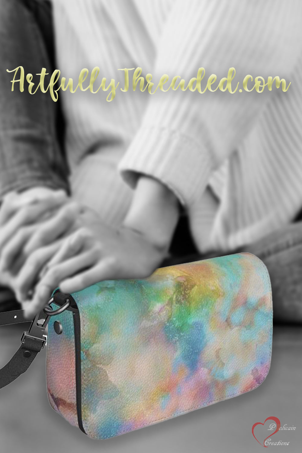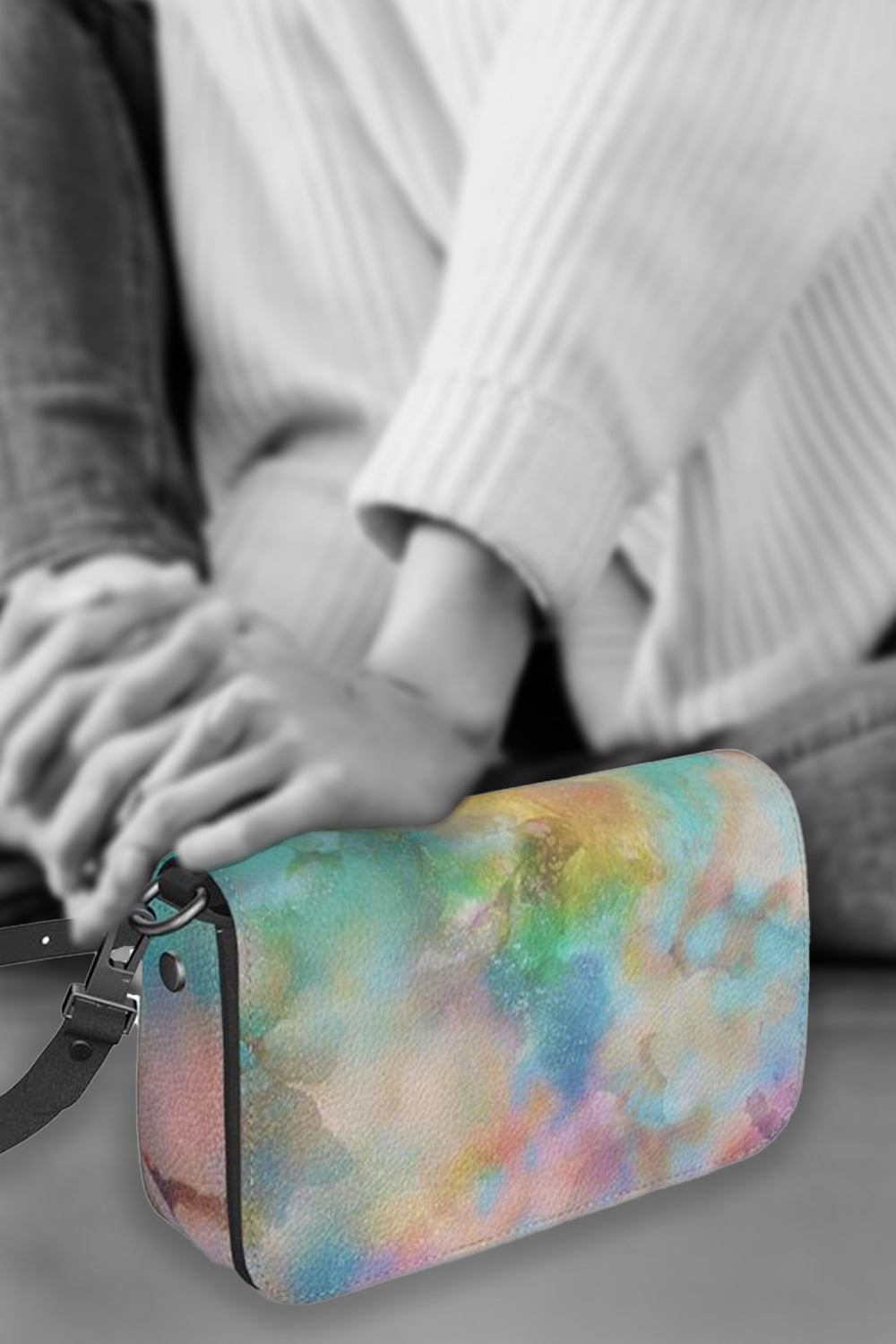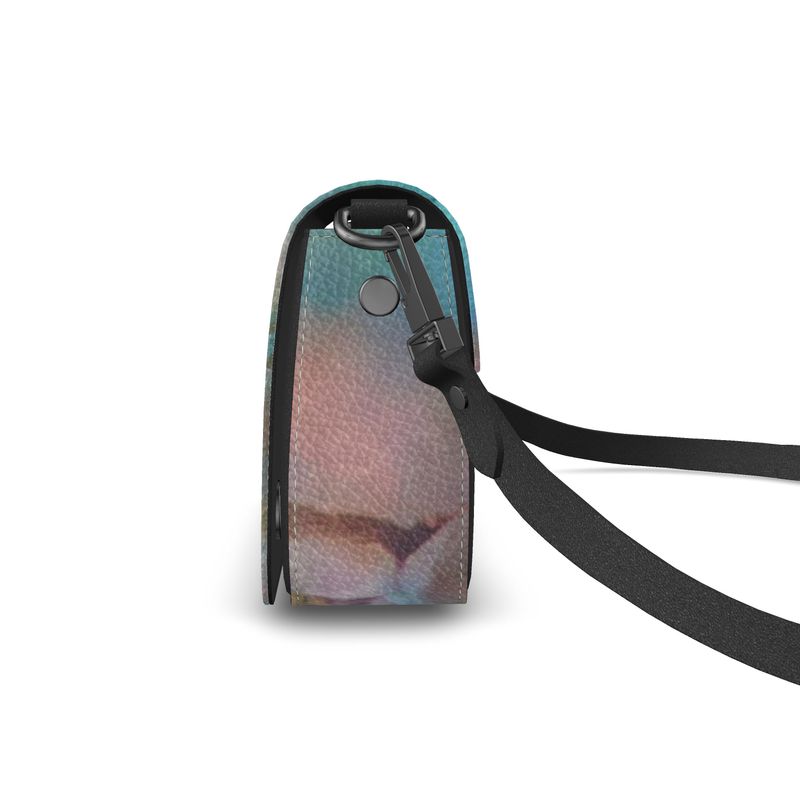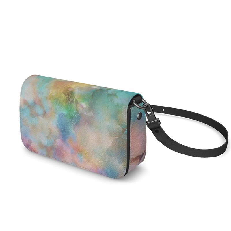 Soft pastels give the illusion of blurred flowers in the Sweetness design. This foldover box bag features your choice of a smooth or bubble Nappa leather body with a faux suede inner lining. Magnetic poppers keep the bag securely shut and comes with either a removable strap or non-removable strap.