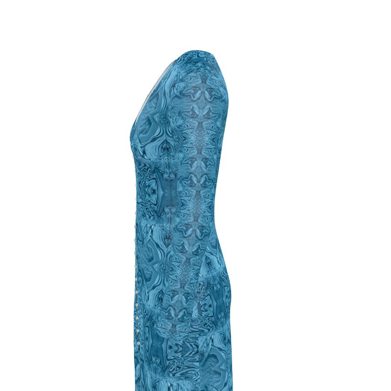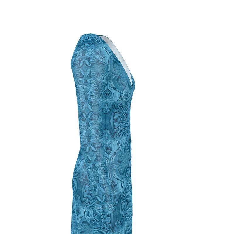 This classic ladies cardigan / button dress is crafted with quality Solange silky or soft fashion Jersey material and features top-to-bottom, easy-to-use buttons and a deep V-neckline. Detailed with unique, digital art designs in blue and black colors, it's complete with long sleeves to keep you warm and stylish.