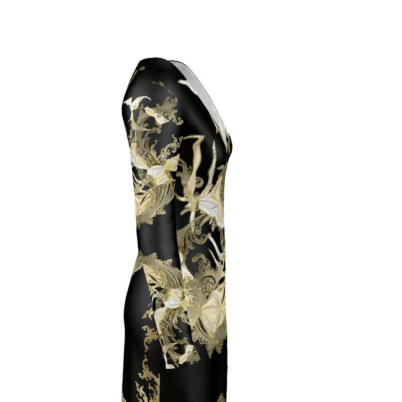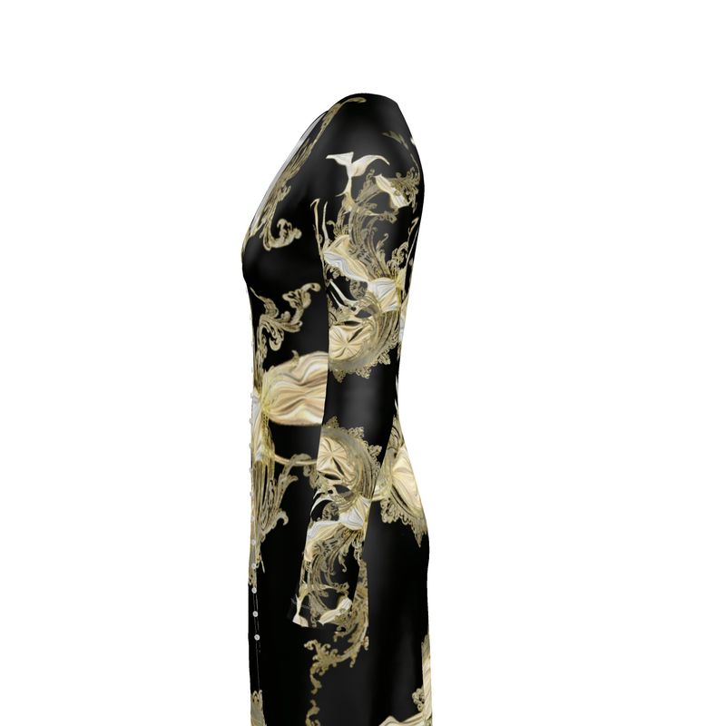 This classy Golden Threads Ladies Cardigan / Button Dress is a versatile 2-in-1 design with v-neck, and digital design in white and creams on a black background, giving it a unique Victorian feel. The piece features long sleeves and is sure to be a timeless wardrobe staple.