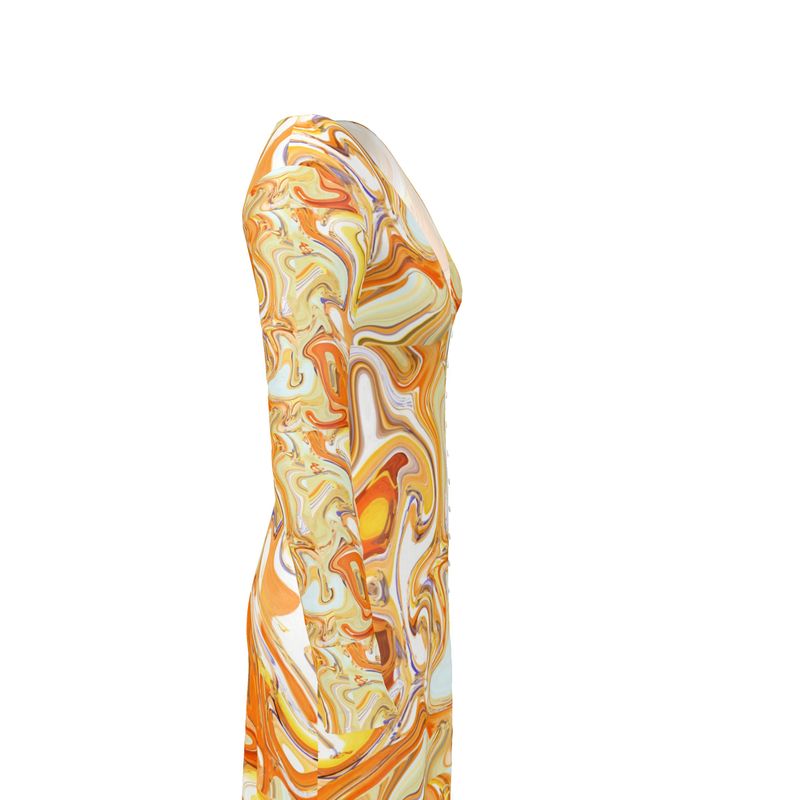 This high-quality ladies cardigan / button dress is crafted from luxurious Solange fabric for an ultra-soft feel and features a colorful, expressive fluid art design with oranges and yellows. For added convenience, it features easy-to-use buttons and a flattering deep V-neckline that combine to create a bold, bright look.