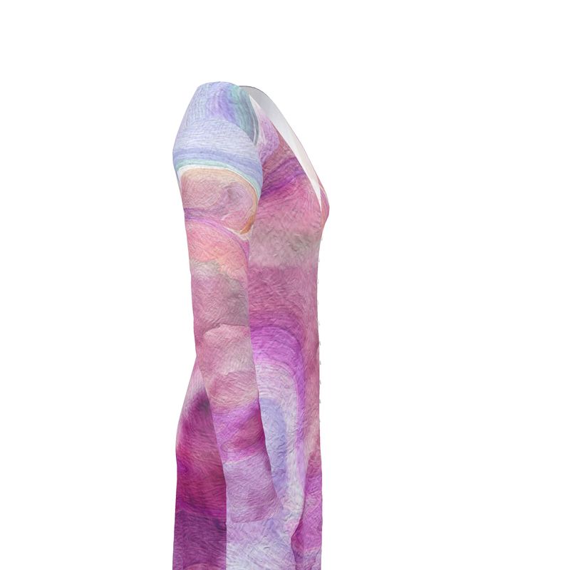 This fashionable ladies cardigan features an eye-catching design that blends pinks and blues for an attractive aesthetic. It is made from Solange silky Jersey or soft fashion Jersey for a luxurious feeling and can be worn as a classic button dress for a timeless yet modern look. Fluid art is now this unique wearable art design.