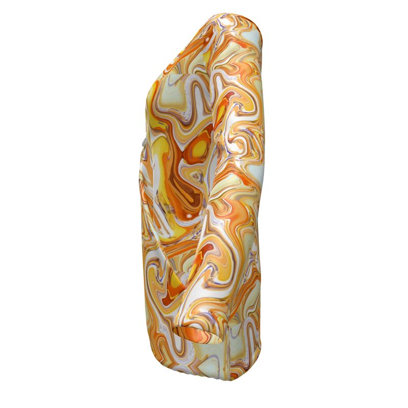 This high-quality cardigan is crafted with a blend of bright colors, perfect for an attractive and professional look. Its design features digital fluid art to provide an eye-catching contrast of oranges and yellows, while the single button closure ensures a bold and bright statement. Enjoy a breathable and comfortable fit with either loose knit or Solange silky jersey construction.