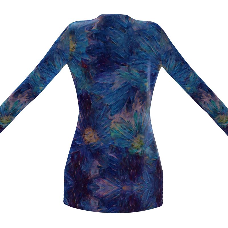 This designer cardigan has a beautiful abstract design with blues, yellows and pinks, and features a single button closure for an attractive and professional look. Crafted from loose knit or Solange silky jersey fabric, this cardigan offers a timeless and sophisticated style.