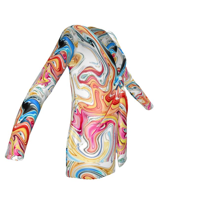 The Party Ladies Cardigan with Pockets is a stylish and comfortable layer for any occasion. Crafted from Jersey Knit fabrics in bold, colorful designs, the cardigan features a fluid digital art design. A waterfall front and drop pockets add a modern touch. Add an element of style to any outfit with this stylish and practical layer.