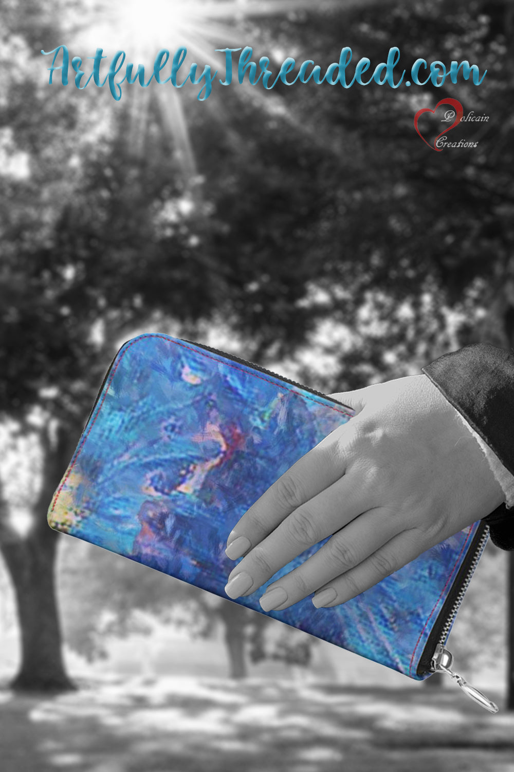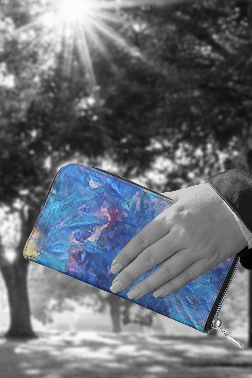 This wallet is perfect for on-the-go organization. Featuring an abstract design of blue flowers, yellows, and pinks printed on Nappa leather or oilcloth matte, the wallet offers up to 10 card slots, multiple inner compartments and an interior crafted with rich leather. With its stylish and durable design, it's perfect for every day use.