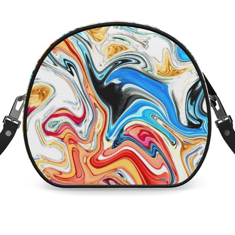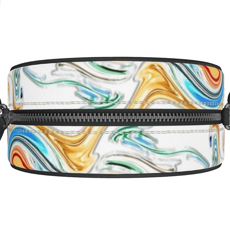 This Nappa leather round box bag is designed to be bold and colorful. Its fluid art design allows it to pair with any look. Ideal for any occasion, the Party Round Box Bag is a statement piece that will turn heads.