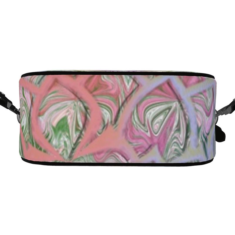 Soft pastel colors with geometric shapes makes up the Pretty in Pastels design on this round box bag. Choose from removable or non-removable strap. Made with Nappa leather and faux suede lining.