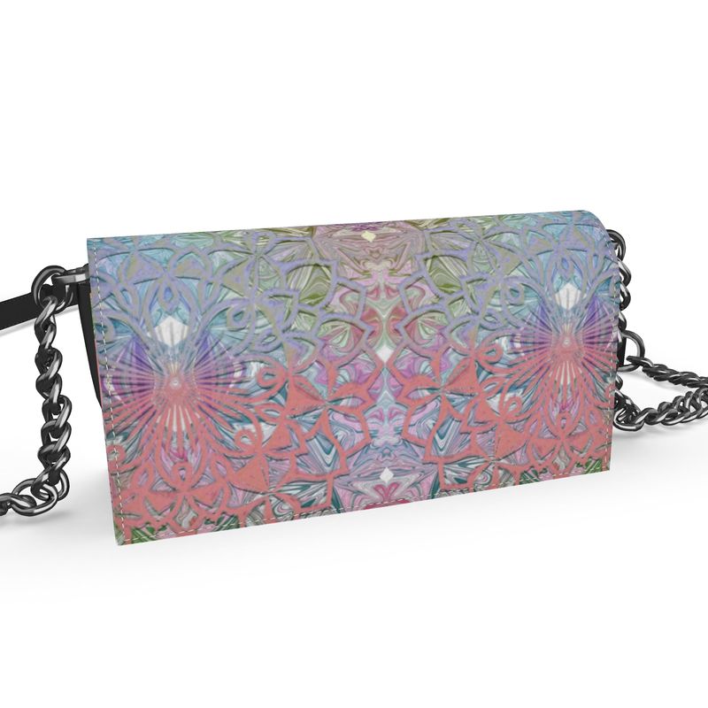 This stylish and multi-functional 'Kenway' evening bag is crafted from Nappa leather, with a detachable strap for an easy transition from clutch to bag. Its inner lining is made from faux suede, offering a cool and comfortable feel. With one internal pocket and a unique digital art design of pastels, geometric shapes, and mandalas, you can look pretty in pastels for any occasion!