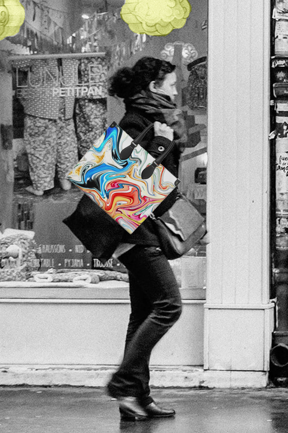 Bright colors mix to create an interesting design which was digitally created. Reds, Blues, Yellows and more move in all directions in this fun piece called The Party. If you like bold accessories, this design is for you. Pair this bag with the matching wrap dress or scarf. A fun piece to add a splash of color to your outfit for those days when you just want to be noticed.