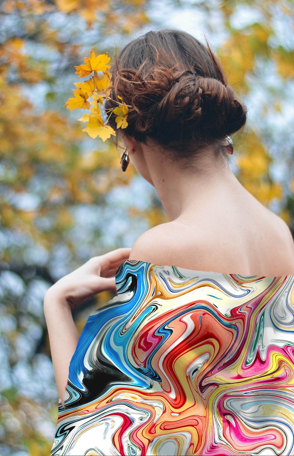 This scarf's eye-catching abstract design, a product of digital fluid art, is lightweight and adds a vibrant and cheerful appeal. Printed, cut & sewn to order. Choose from multiple fabric choices.