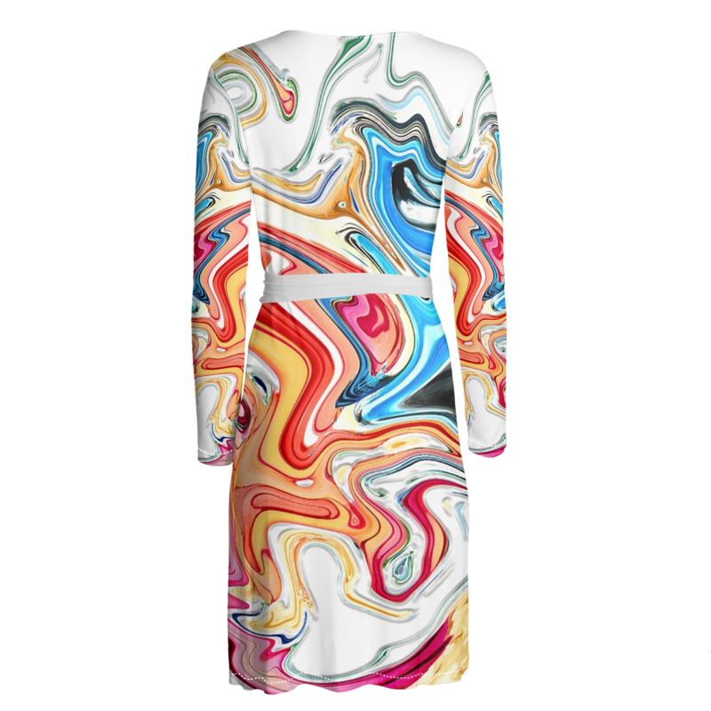 Bright colors mix to create an interesting design which was digitally created. Reds, blues, yellows and more move in all directions in this fun piece called The Party. If you like bold pieces of clothing, this design is for you. Wear this wrap dress with heels or with boots depending on your mood. Pair it with colorful jewelry for even more interest. A fun piece for those days when you want to be noticed.