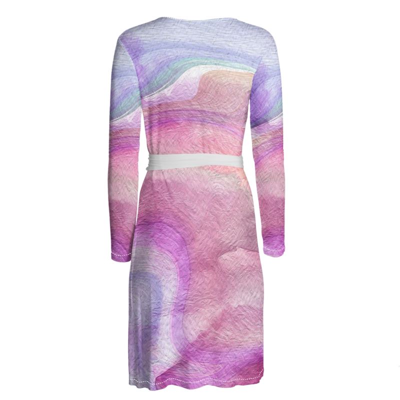 This design features fluid art in pinks and blues. Calming and beautiful on this wrap dress with white tie. Wearable art at its best! Dress is made from poly-elastane blend Jersey, in your choice of Solange silky or soft Jersey, and has long sleeves, a v-neck and above-the-knee length.